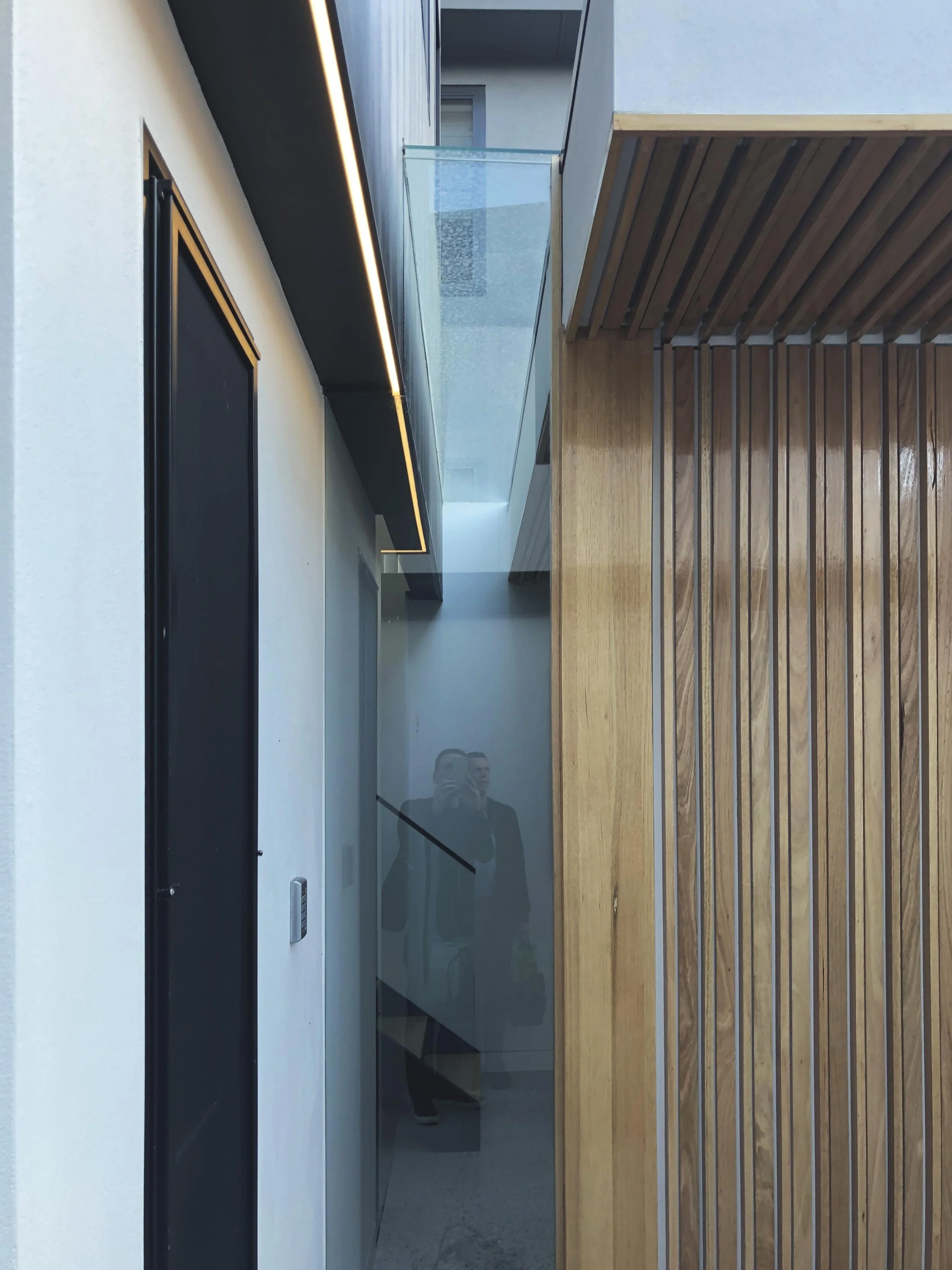 The island is the main food preparation and cleaning area. It also functions as a divider to the dining and circulation area and is used for seating at breakfast time and to interact with the cook. To enhance the ‘floating’ effect at night, L.E.D., strip lighting on top and below the joinery is used.