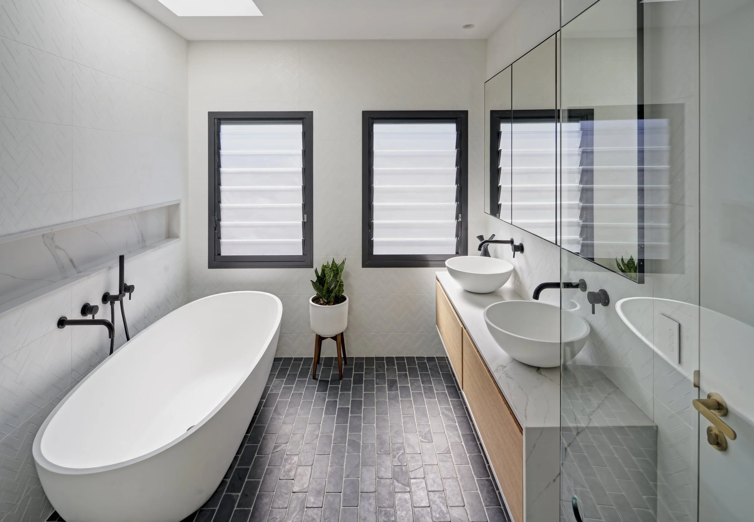 Large sliding doors were installed on the opposite side of the room to visually extend the space to the boundary. Instead of a splashback, a frameless window was introduced along benchtop to allow natural light and views of plants also whilst cooking.