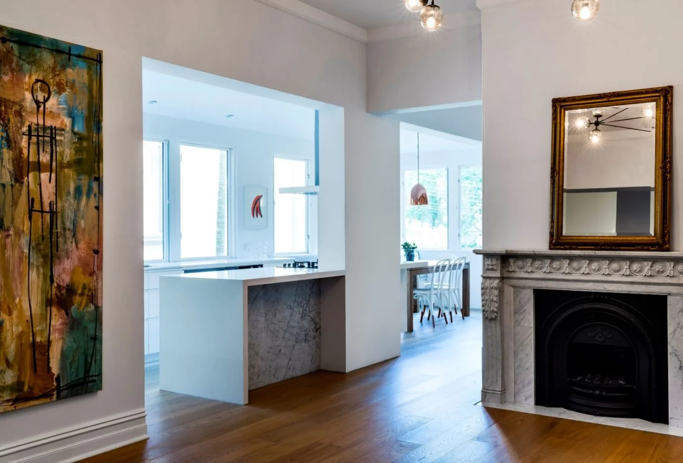 This apartment renovation started by removing in-fill walls and ceilings added over the years. The kitchen was moved from the rear service wing to the sunroom, to connect to the two re-instated ‘grand’ living and sittings rooms of the apartment. The former bathroom was divided into two, by moving the laundry off a corridor.